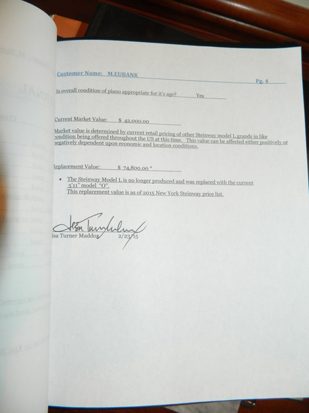 9/15/2017 - We have this piano in tune and sounding great! This piano has a big beautiful sound. Steinway Model L is the perfect balance between size and sound for a home setting. This piano shows minimal wear and the case is gorgeous. You can see in the last picture that this piano was valued by Turner Keyboard in 2015.